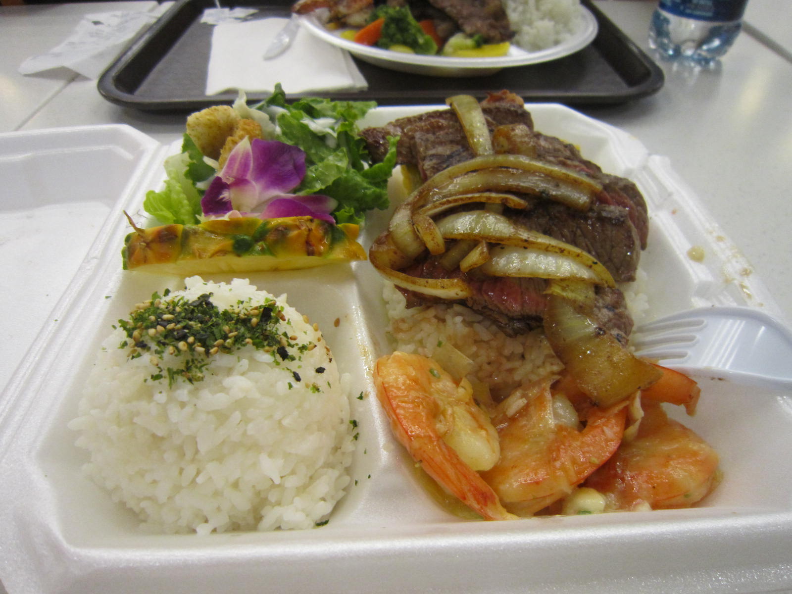夕食はアラモアナのフードコードで、ガーリックシュリンプとステーキ。