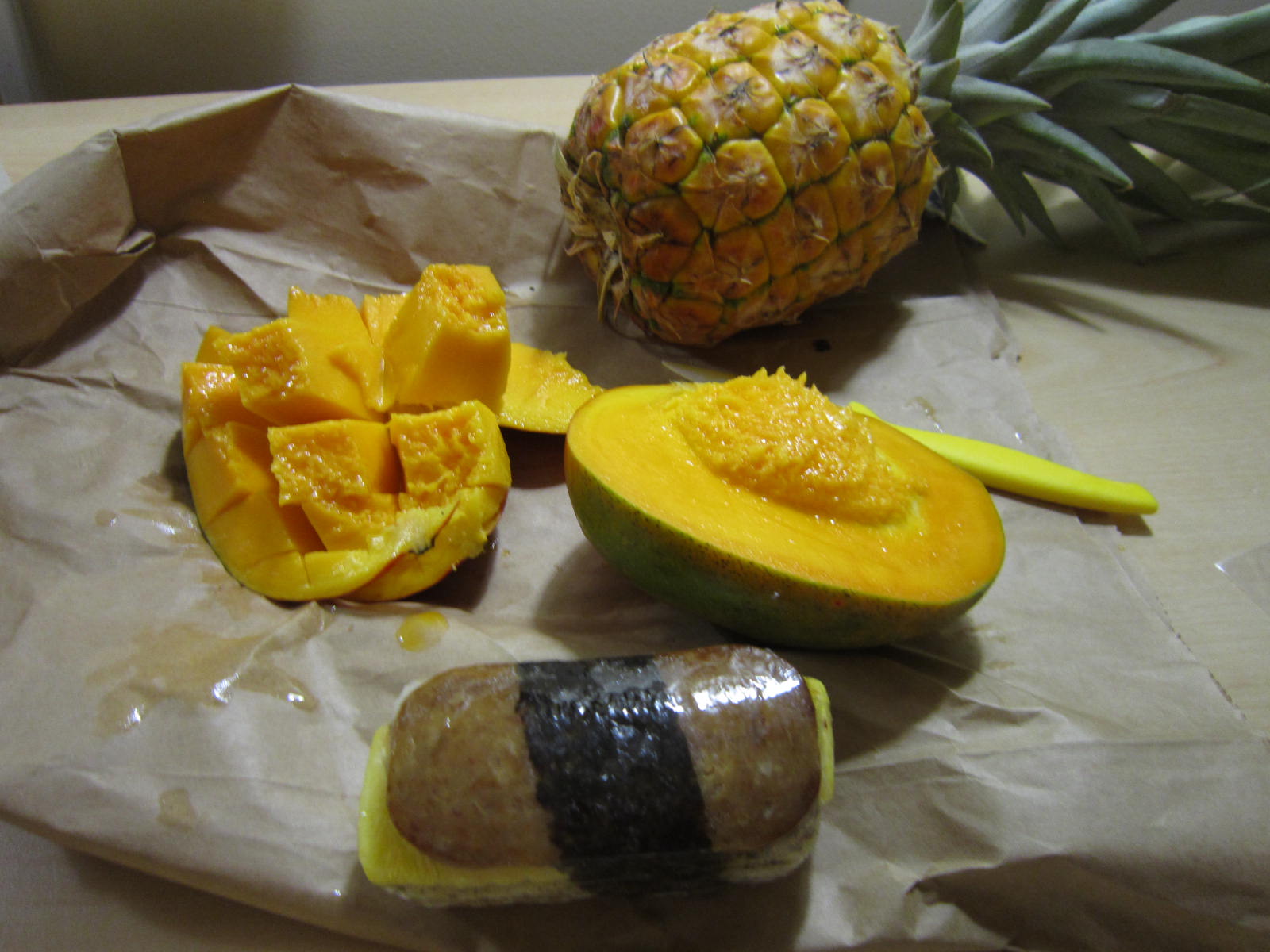 夕食はホテル近くのスーパーでパイナップルとスパムおにぎりを買って、